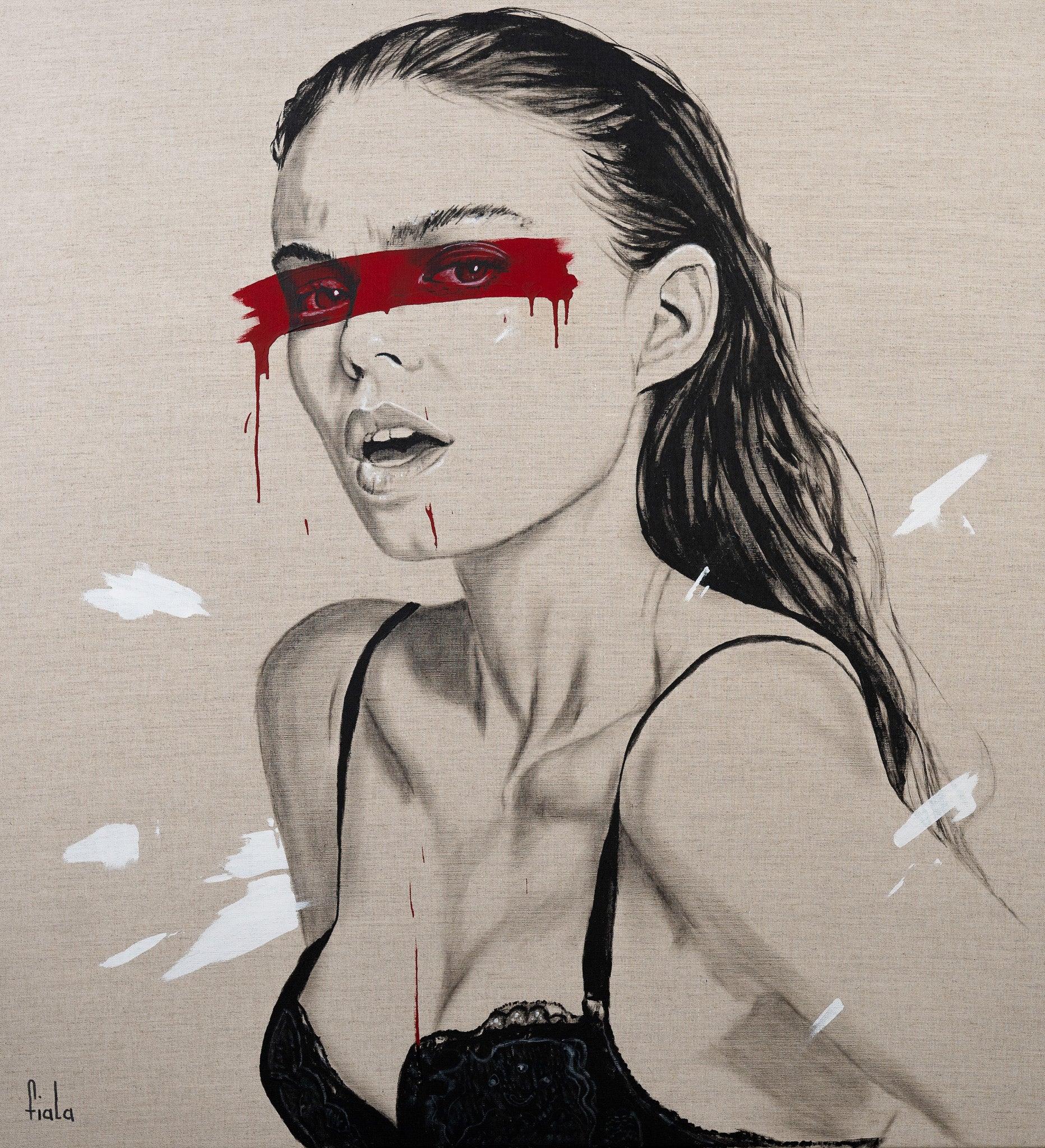 Created with black paint on unprimed natural materials such as sand, fabric scraps, or plaster, they depict highly detailed and emotionally compelling faces. A red brushstroke across the eyes draws attention while simultaneously creating a barrier. The eyes remain visible, yet the red line alters perception, intensifies emotions, and establishes a striking tension between expression and obstruction. Is it a symbol of societal censorship, or does it direct the necessary focus to the face?